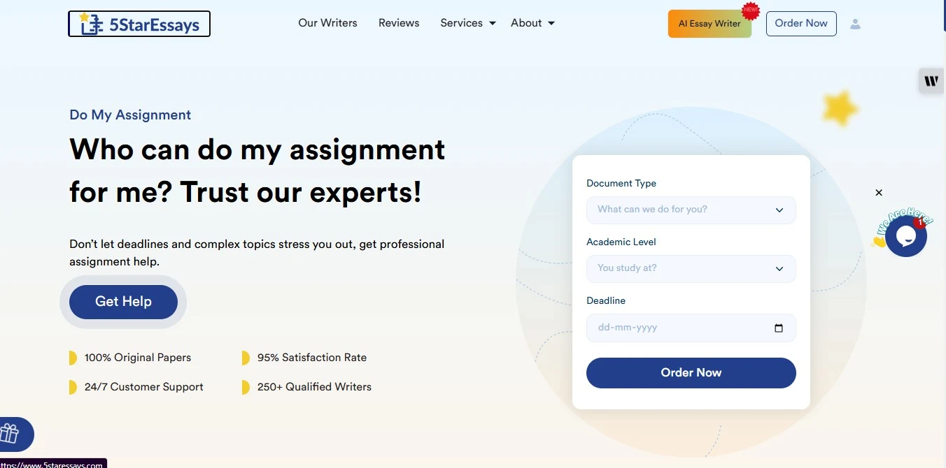 Students start by creating an account on the 5StarEssays website. They then fill out an order form with details: assignment type, topic, number of pages, deadline, and academic level. Next, the system shows available writers; students select one and pay the quoted price. After payment, the writer begins work. Once the paper is complete, the student can download the finished essay from their account. Students can also message their writer through the portal to clarify requirements or request edits. The process is mostly managed online through the company’s website.