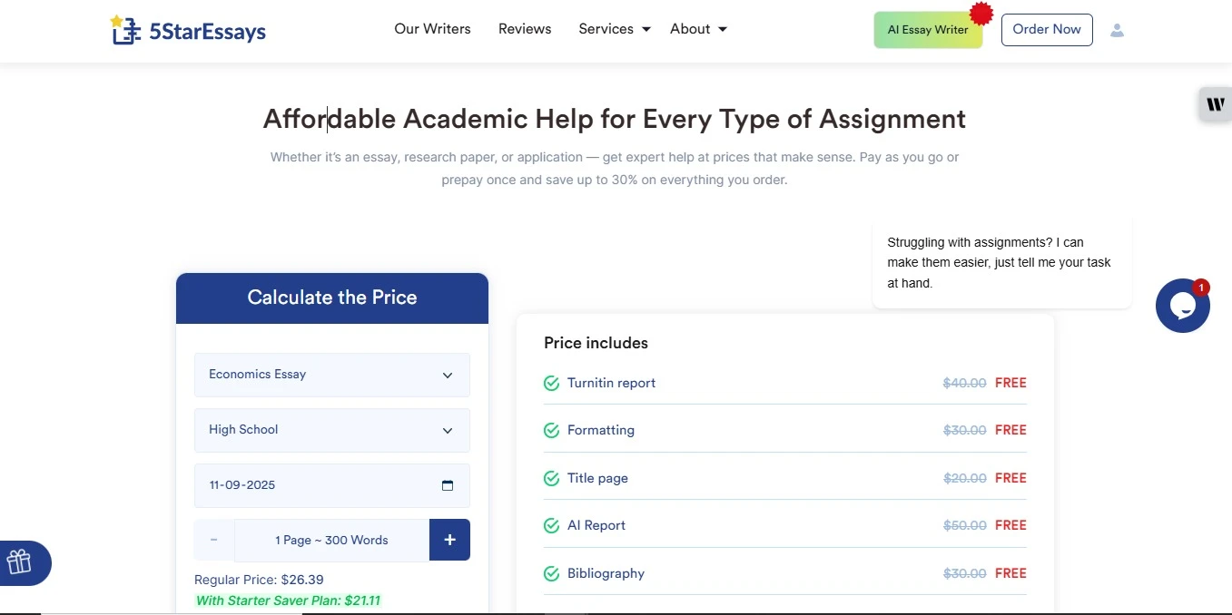 5StarEssays charges by the page (one page = 300 words). Pricing depends on the level of study: high school essays start at USD 14.03 per page, college essays at USD 18.59, and master’s level at about USD 23.15 per page. Editing and revisions are listed as free of charge, while extras like a Turnitin plagiarism report start around USD 12.13 per page.