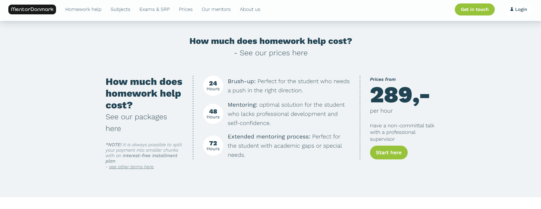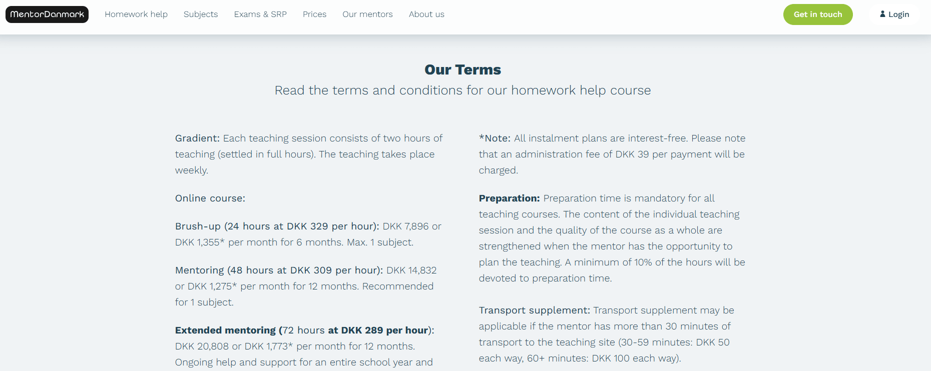 MentorDanmark offers flexible payment options. You can pay per session or package, and larger plans (like exam prep bundles) often come at a slightly lower per-hour cost. Importantly, the site explicitly allows customers to split payments across several months. For example, one FAQ explains an interest-free installment plan: you can spread a prepaid tutoring block over up to 6 months, paying a 39 DKK fee per installment. They accept standard payment methods (credit card, bank transfer) through their portal. The website occasionally runs promotions (e.g. summer or exam season discounts), but these are special cases; normally the listed hourly rates apply. No mention of registration or booking fees was found – you simply sign up for a tutoring plan and pay for hours booked.