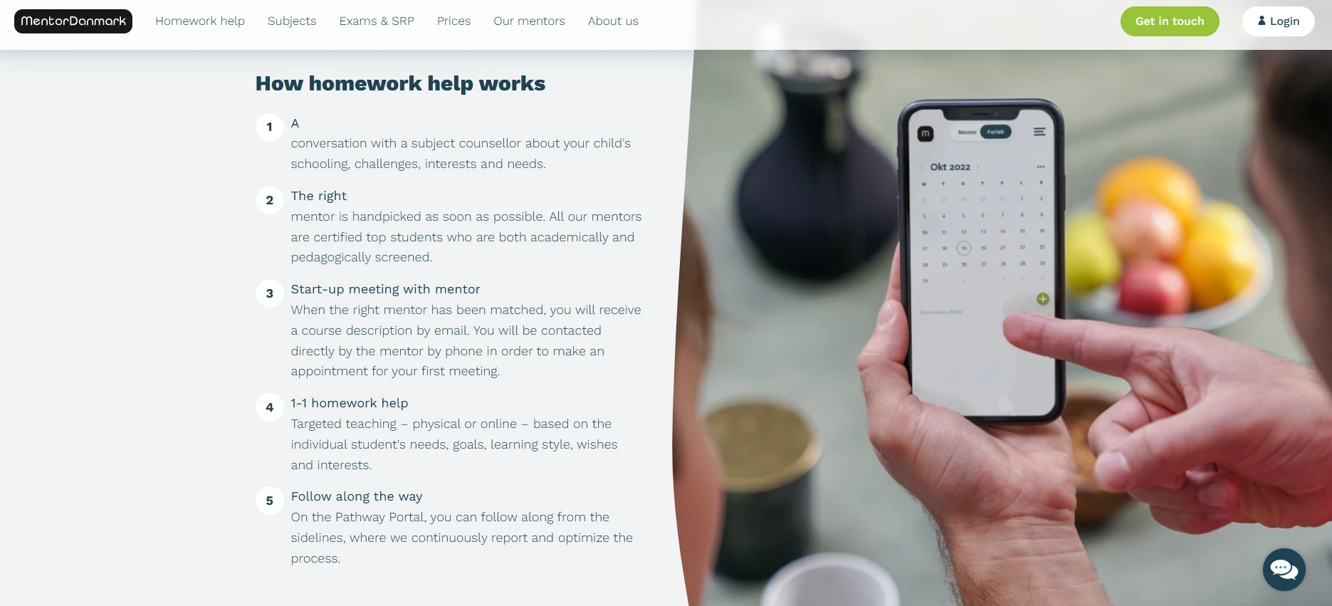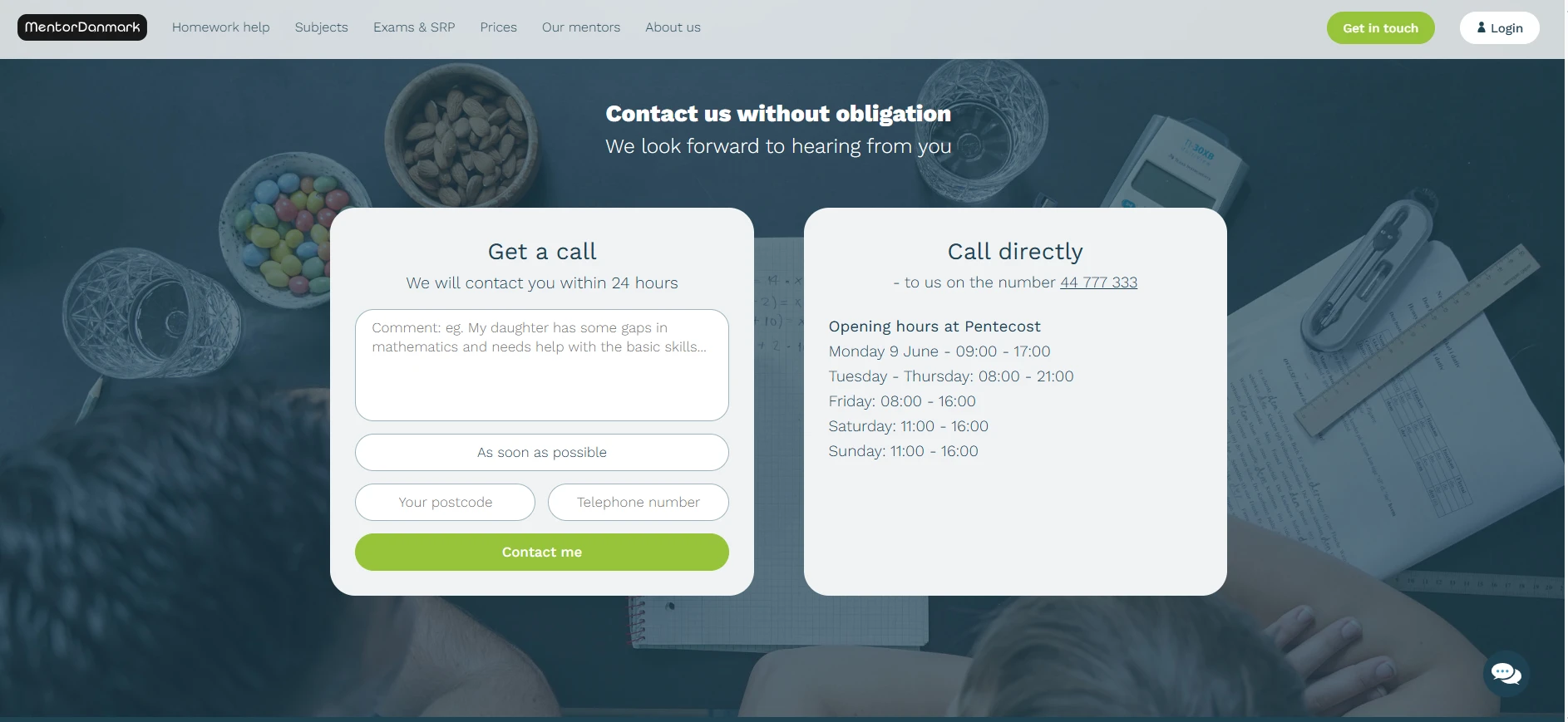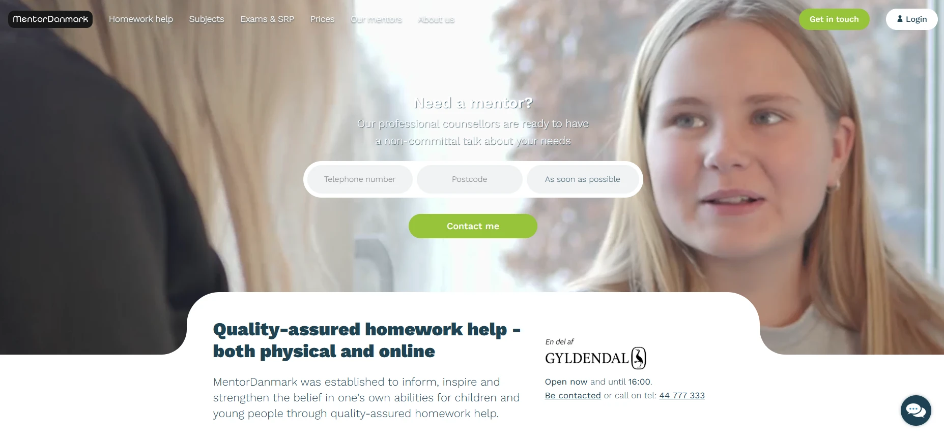 Students (or parents) start by contacting MentorDanmark through their website. You can fill out the “Contact us” or “Bliv kontaktet” form. After that, a study advisor will call to discuss the student’s needs. From there, MentorDanmark will select a suitable mentor and schedule the first lesson. The initial consultation is free and has no commitment. You can also call them directly at +45 61 61 77 77 (they have staff answering daily).