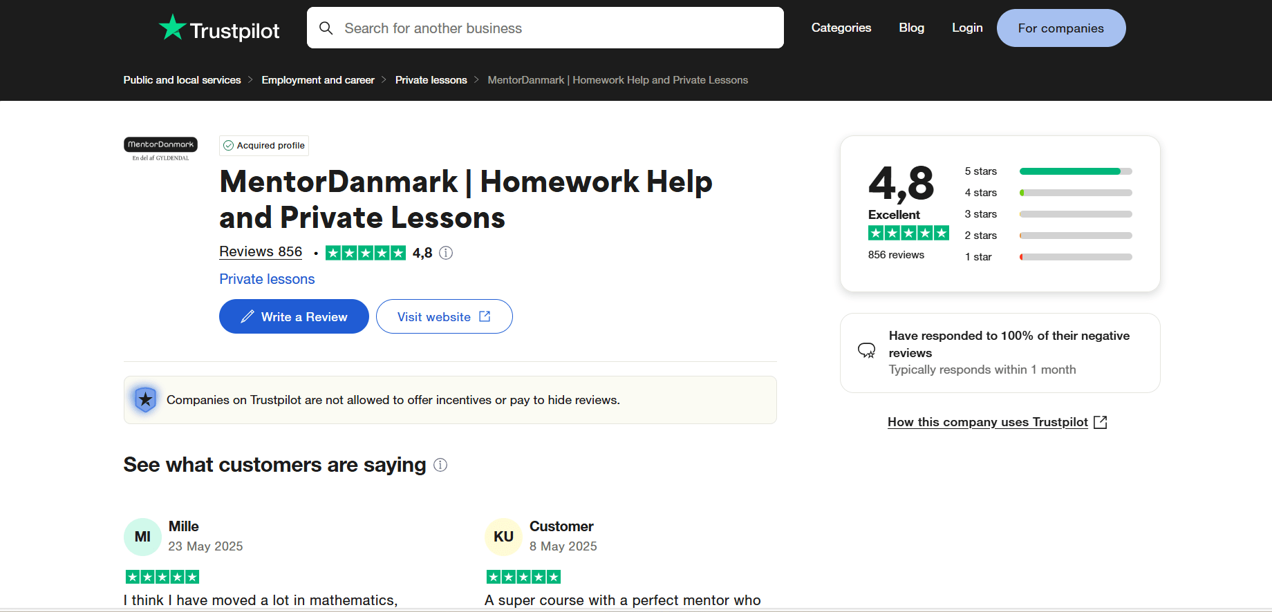 Customers generally give MentorDanmark very positive feedback. For example, the company’s website notes that it holds the majority of 5‑star reviews on Trustpilot. Third-party data indicate an average Trustpilot rating around 4.8 out of 5 (based on thousands of reviews). Student and parent quotes on the site echo this praise: many remark on how much their child improved and gained confidence. (For instance, one 5th grader says, “I became better in school after Marie-Louise came”.) Mentors are described as encouraging and skilled. We found no reports of scams or serious complaints; in fact, MentorDanmark’s emphasis on quality (certified mentors, satisfaction guarantee) seems to hold up. One academic review even highlights the company’s reputation for reliability and strong pedagogy. In summary, both site testimonials and external review aggregators indicate high satisfaction: reviewers praise the skilled tutors, personalized matches, and results. Overall, MentorDanmark comes across as a legitimate, high-quality service, backed by its Gyldendal affiliation and glowing user ratings.