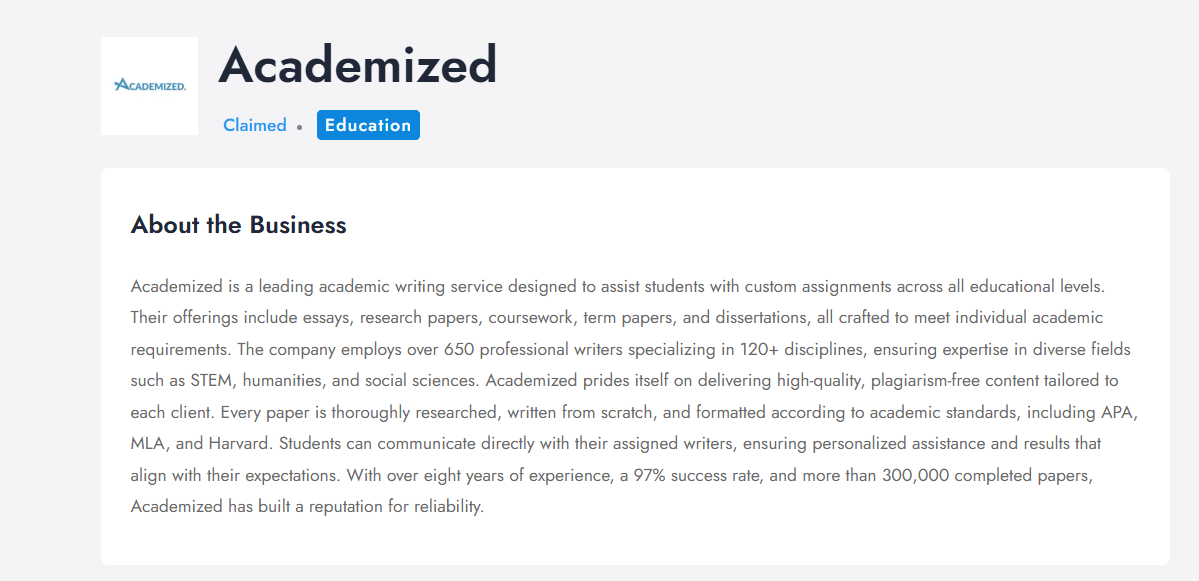 Scale of operation: Academized is headquartered in Paphos, Cyprus. It markets its services globally and claims to serve students “worldwide”. There are over 650 professional writers on staff and they report completing over 350,000 papers. The platform mainly targets students in English-speaking countries (US, UK, Canada, Australia) though it accepts clients globally. It does not list office employees, but its support team is available 24/7 via chat and phone.