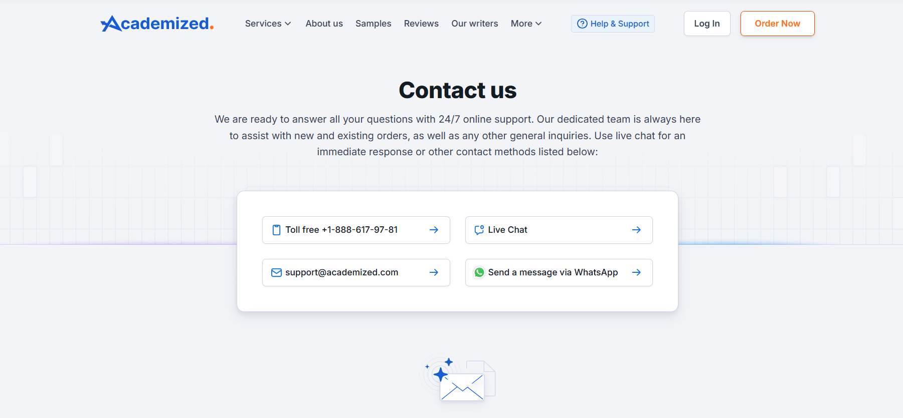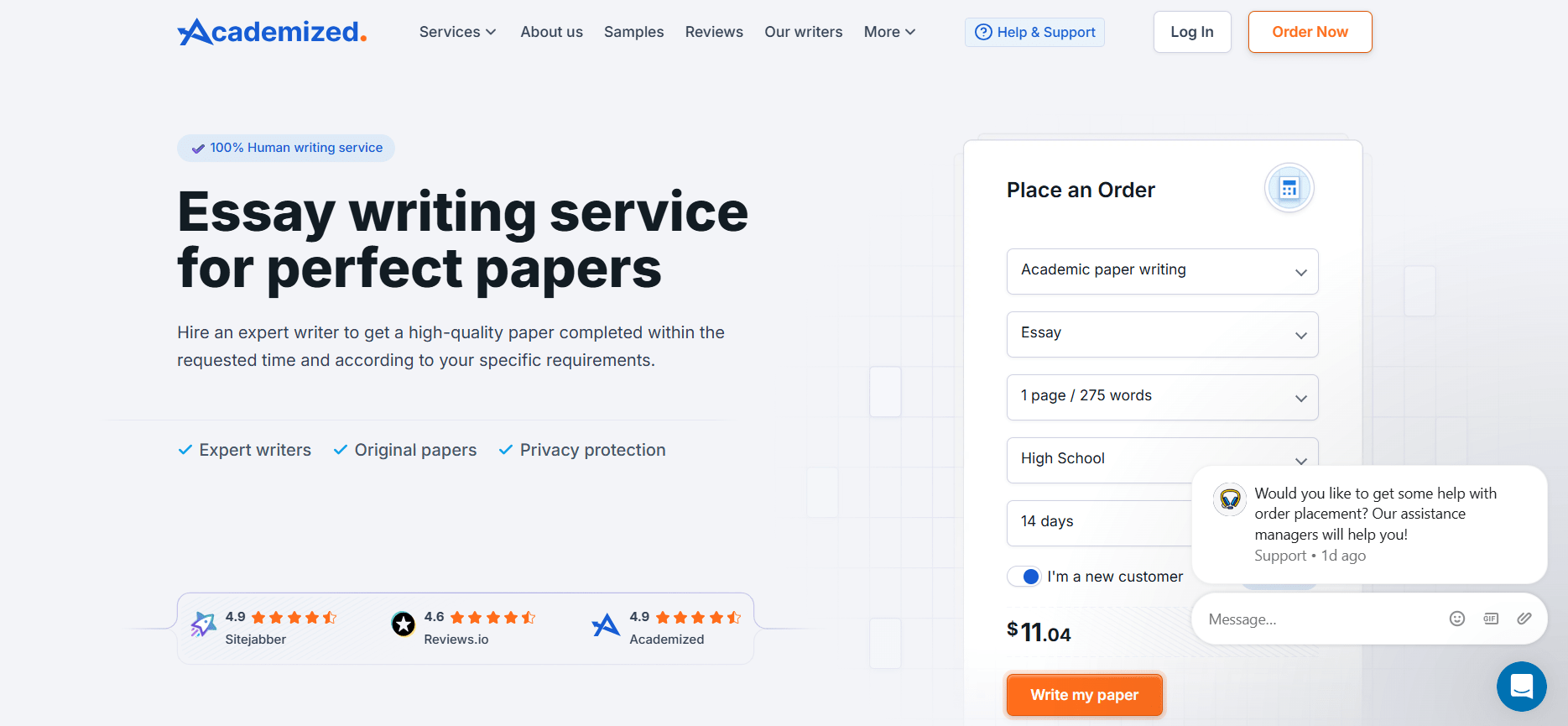 Types of services: Academized offers academic writing help (research papers, essays, thesis, dissertations, case studies, lab reports, book reports, admissions essays, etc.), plus editing and proofreading. It also advertises services like resume writing and personal statements. These cover high school through postgraduate levels.