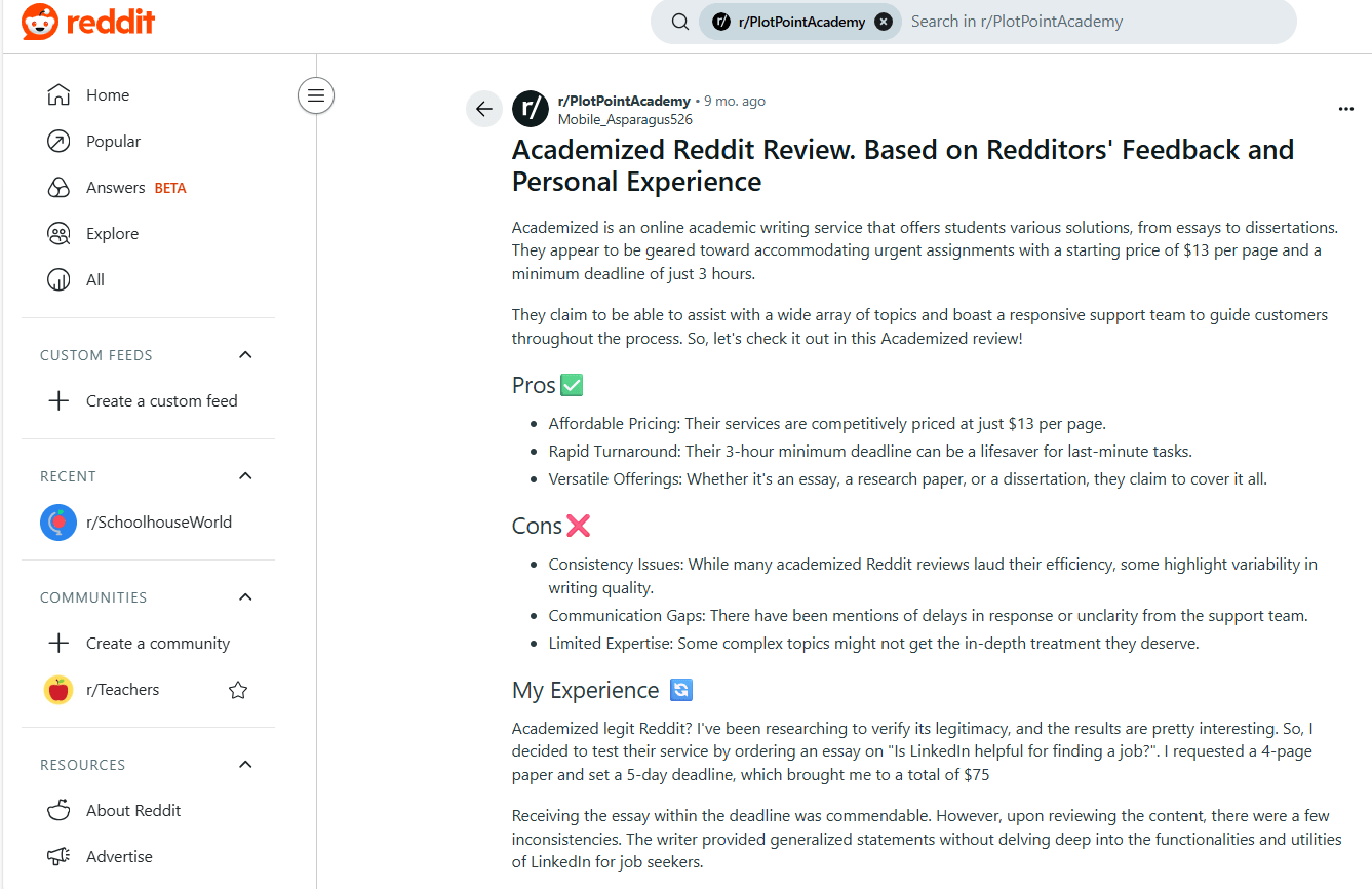 - PlotPointAcademy Reddit Review: A Reddit-based review notes “affordable pricing” (about $13/page) and a 3-hour minimum turnaround. It also points out that quality can vary, with some users “highlight[ing] variability in writing quality” and slow support responses. One user reported ordering a 4-page paper for 5 days at a cost of $75.