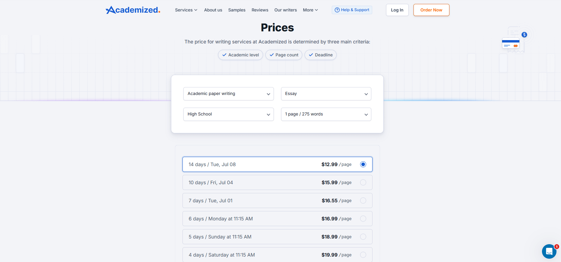 How much does Academized cost? Pricing starts around \$12.99 per 275-word page. For example, a 4-page research essay with a 5-day deadline cost one user \$75 (~\$18.75/page). The exact cost depends on page length, deadline, and add-ons. Urgent orders and additional features can increase the total significantly.