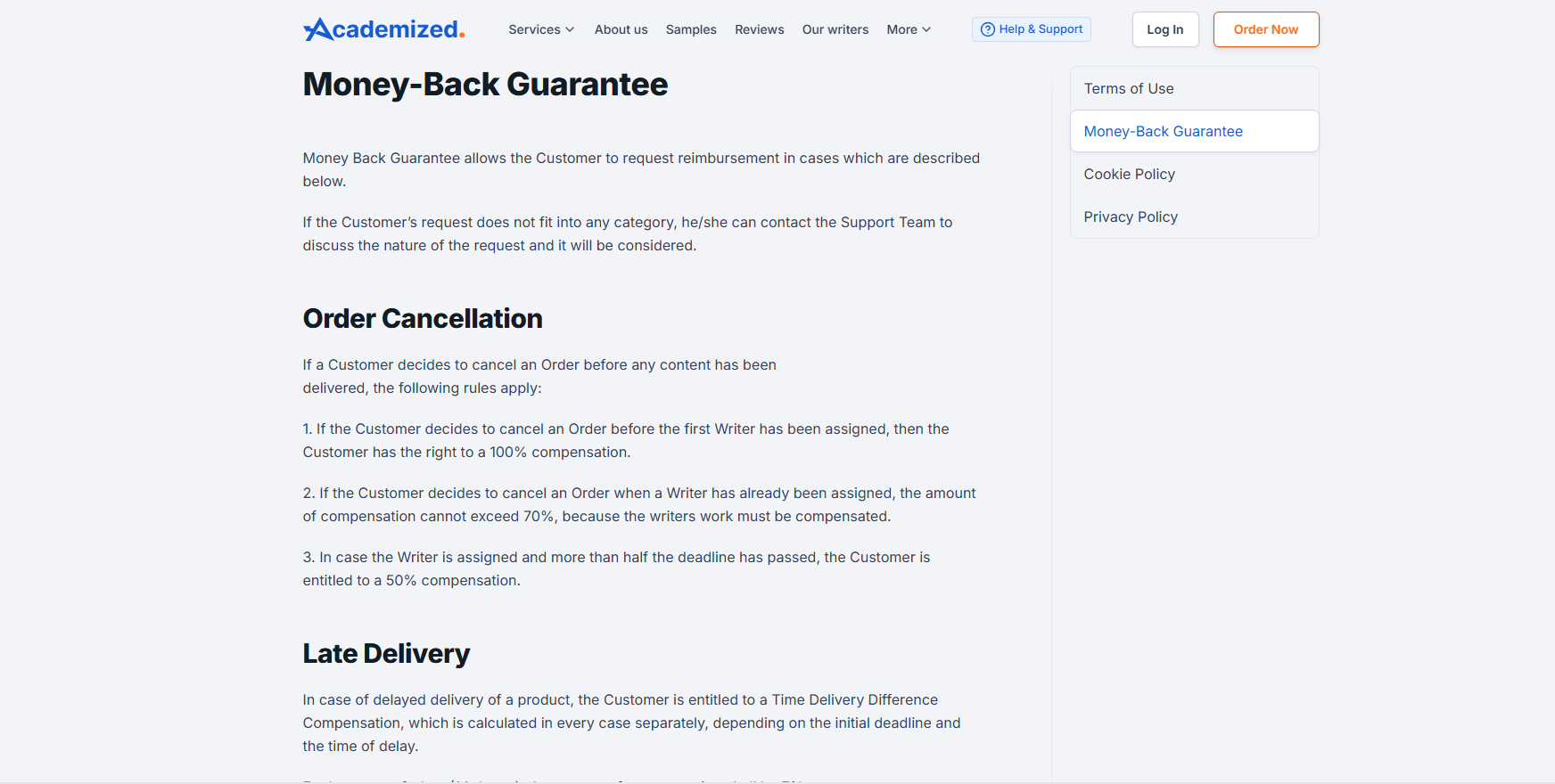Academized has a detailed refund policy. If you cancel before a writer is assigned, you get a 100% refund. After a writer is working, the maximum refund is 70% depending on timing. For late deliveries they credit a small percentage (e.g. 7% for long delays). In principle they offer compensation for poor quality work after review. However, many users say these promises are not always met. In fact, ScamFighter reports customers trying to get refunds “were refused,” indicating the money-back guarantee may not be reliable. Always check their official refund policy for exact terms, and be aware some reviewers found it hard to get a full refund.