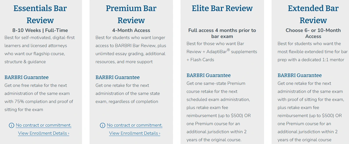 Customer Support and Policies: Barbri provides support via phone, email, and live chat (through its website and student portal). In practice, response times are generally reasonable for pre-enrollment questions. During courses, students can ask their mentor or instructors with technical issues. However, in online reviews, users occasionally mention slow support replies or website glitches (more often on unrelated platforms, since direct support reviews for Barbri are scarce). Barbri’s refund/guarantee policy offers a free retake if you don’t pass (the BARBRI Guarantee), but only limited refunds for cancellations as noted above.