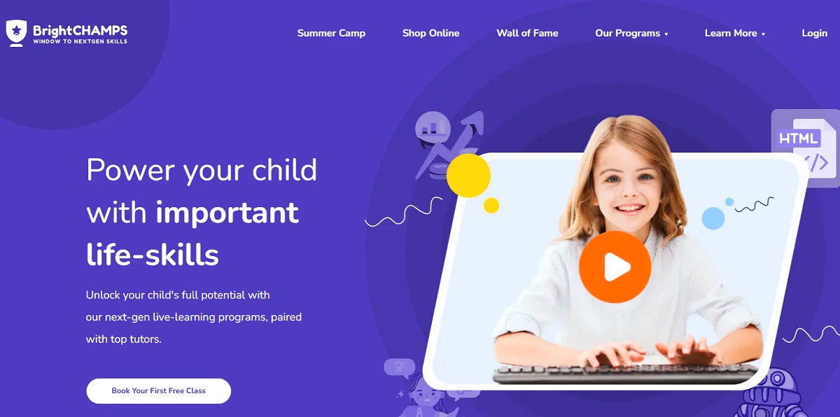 BrightCHAMPS is an online learning platform for children ages 6–16, offering live 1-on-1 classes in coding, robotics, financial literacy, English, and other STEM subjects. Founded in 2020, it connects students with certified tutors through scheduled virtual lessons. The goal is to build “next-generation” skills via interactive projects.