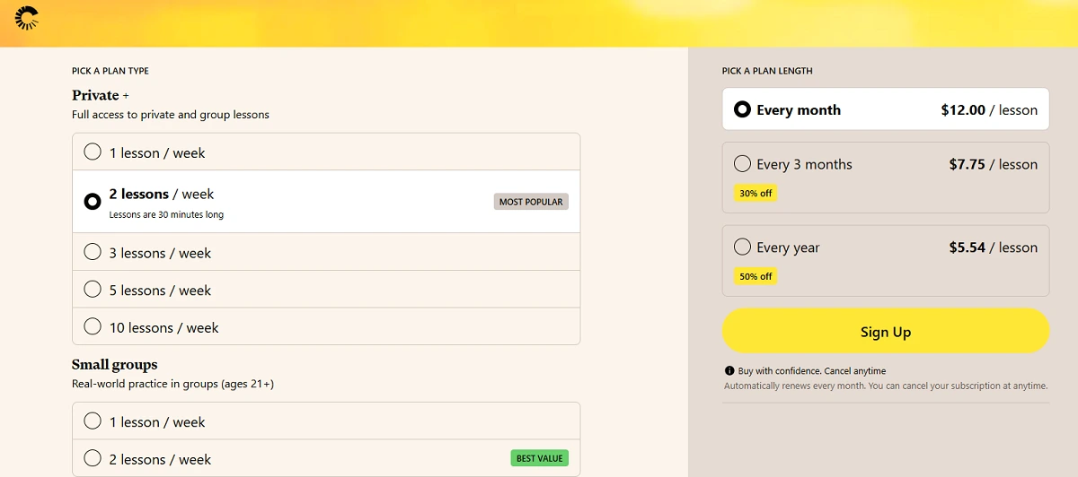 With Cambly, you pick how many lessons per week (e.g. 1, 2, 3, 5, or 10) and lesson length (typically 30 minutes). Then you choose a subscription duration (monthly, 3 months, or yearly). The platform shows a price per lesson based on these choices. You pay upfront for the entire billing period. Lessons on a monthly plan cost more per lesson than on an annual plan, reflecting the discounts for longer commitments.