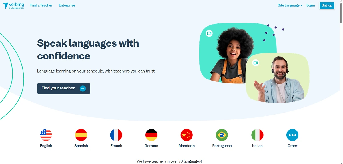 Verbling – A language tutoring site focused on quality. Verbling requires tutors to be certified or highly qualified. Hourly rates are generally higher. It offers a classroom environment and professional teachers. Verbling has fewer tutors than iTalki/Preply, but higher quality screening.