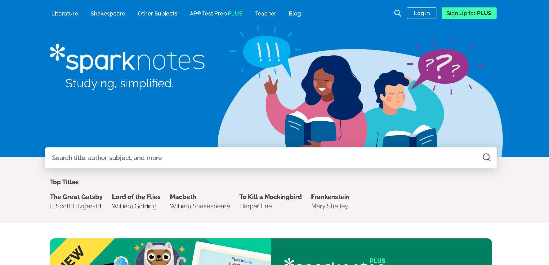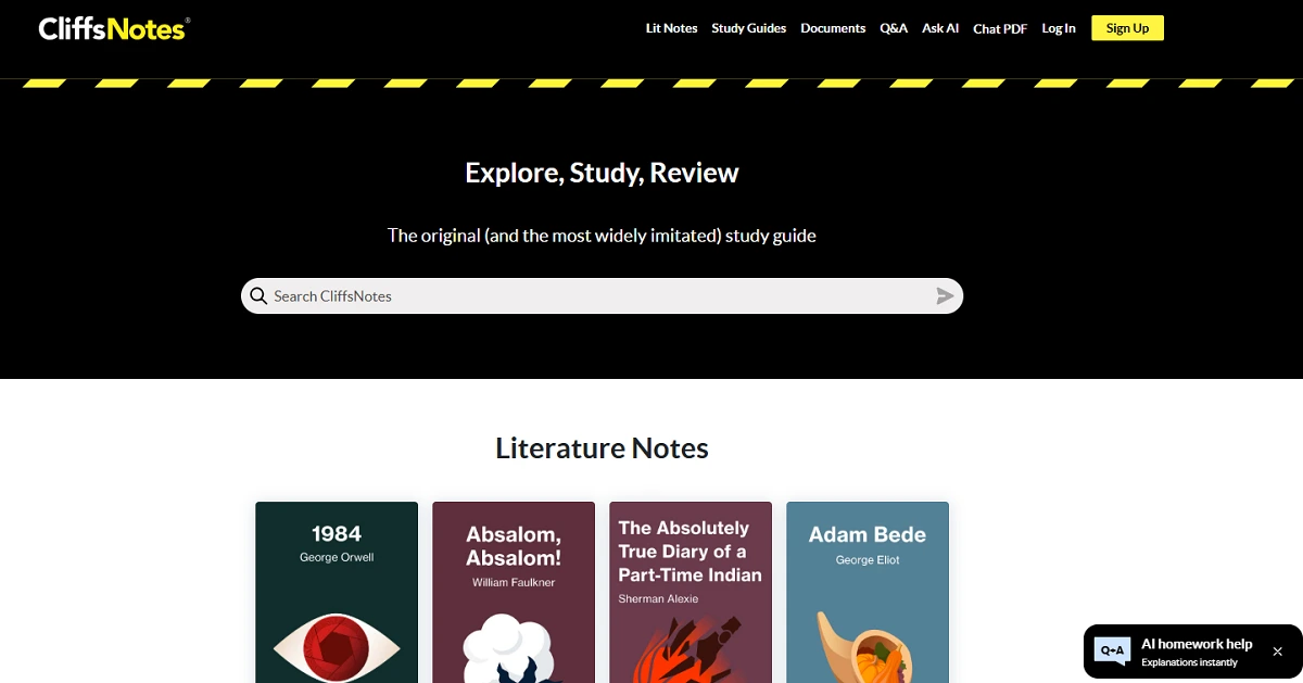 - SparkNotes – A free study guide site primarily for literature (book summaries, Shakespeare, etc.). Basic content is all free (no login needed), plus there is a “SparkNotes Plus” plan ($4.99/month or $24.99/year) to remove ads and add tools. Pros: very good free explanations for classic texts and some subjects, no cost. Cons: limited to literature and related subjects, with fewer user questions or custom help than CliffsNotes.