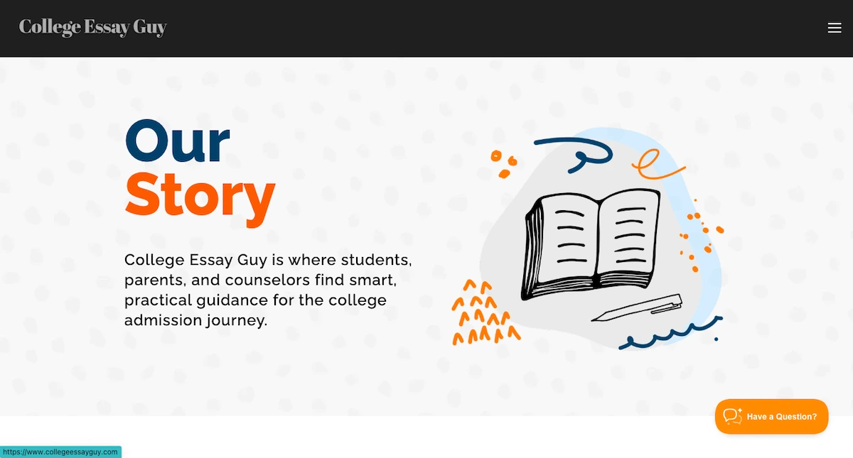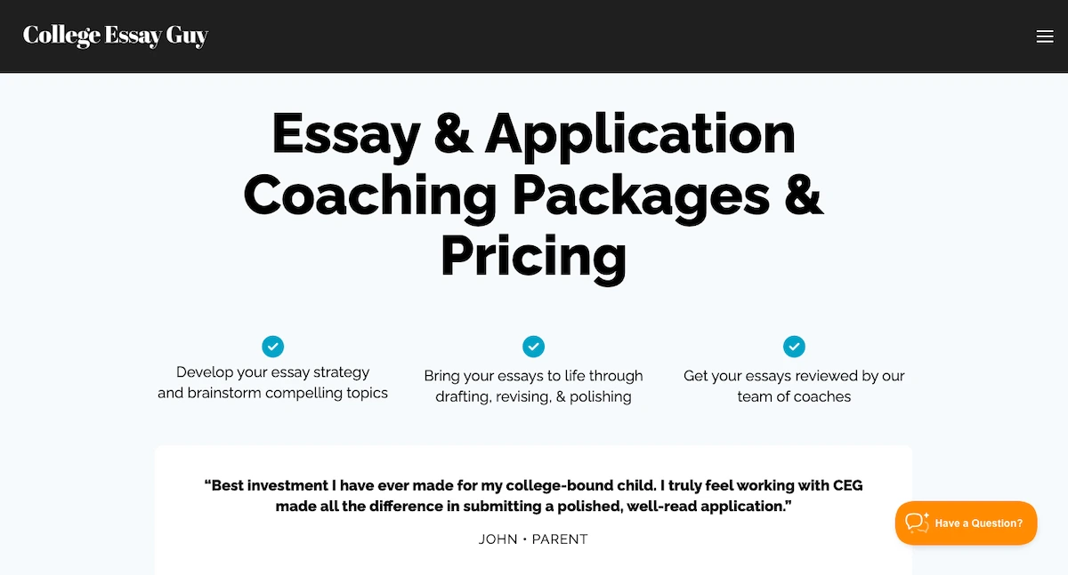 Types of services: CollegeEssayGuy offers mostly college admissions-focused services. This includes 1:1 essay coaching, college admissions counseling, and even graduate school essay help. They also run online courses and workshops (e.g. essay writing courses) and host live events (webinars, camps). Their offerings include everything from strategy sessions on school lists to in-depth essay edits. In short, their services revolve around the college application process – brainstorming, essay drafting, and application strategy.
