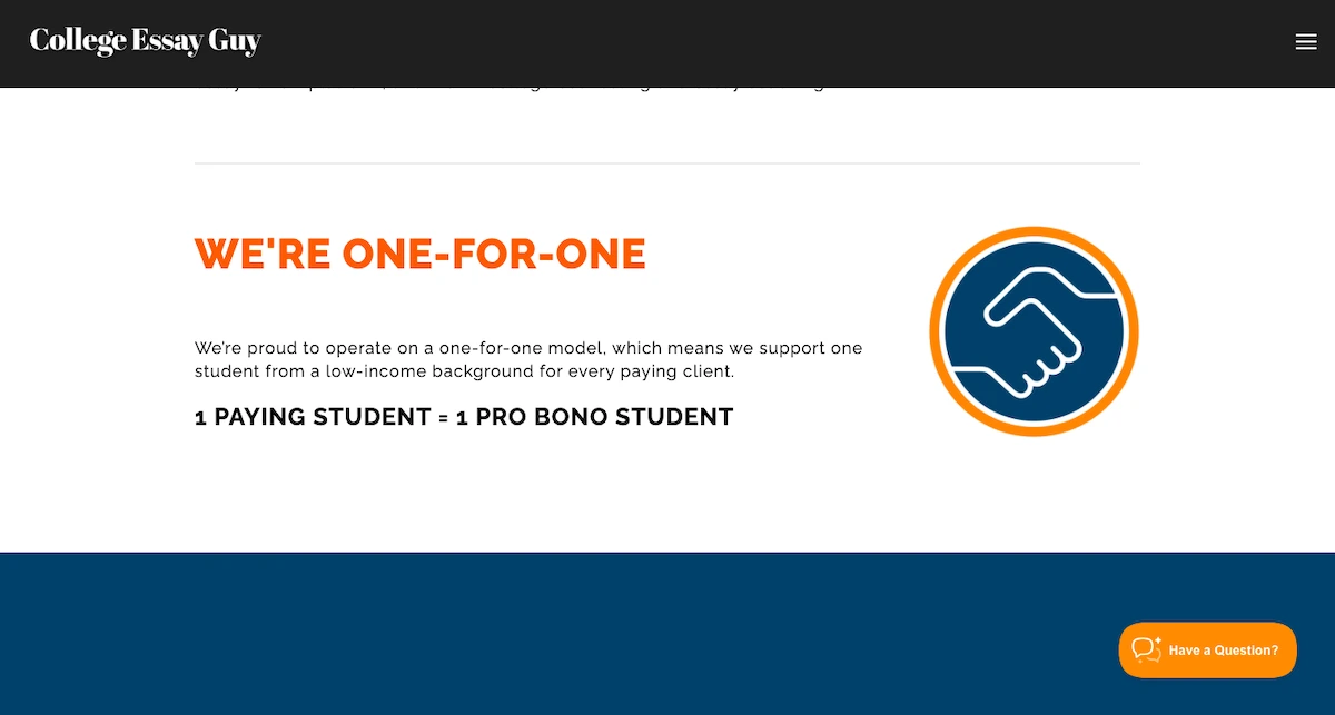 Reviews generally confirm these USPs. Students frequently mention how personal and supportive the process is (matching the “personalization” claim). Trustpilot reviews often note the experience and empathy of coaches, echoing the “veteran team” claim. The high acceptance statistics are supported by many testimonials of students getting into selective schools, though it’s understood that success also depends on academics beyond essays. The one-for-one mission is unique among competitors and is highlighted in CEG’s own messaging (and no reviews dispute that claim).