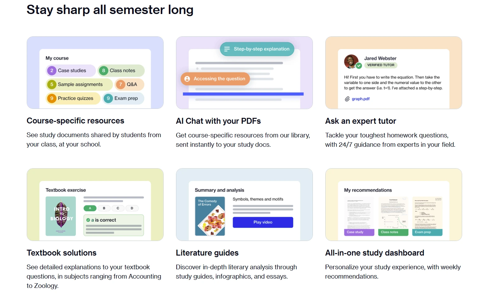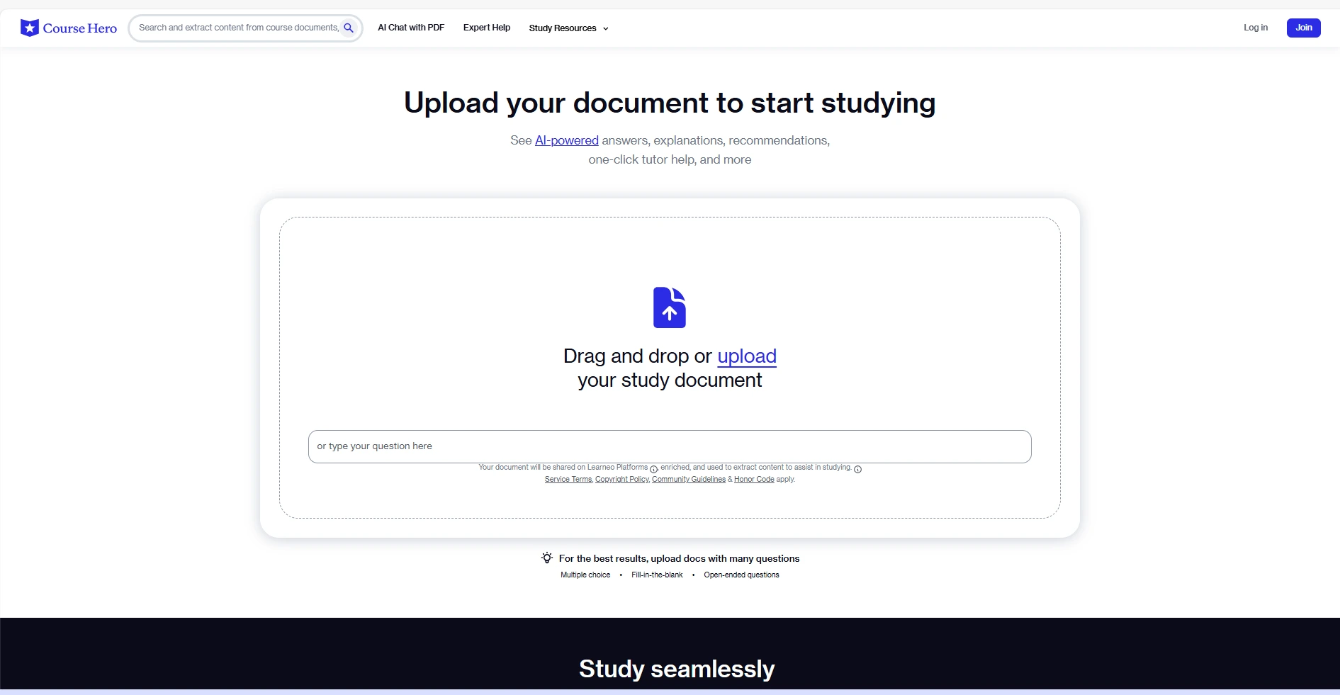 Course Hero’s unique selling points are its large, crowdsourced content library and on-demand help. It boasts tens of millions of user-uploaded documents (notes, exams, essays, solved problems) that students can access by contributing or subscribing. The site also offers features like step-by-step textbook solutions, practice quizzes, and even AI-powered tools (e.g. a “Chat with PDF” feature). These aim to make studying efficient and to cover many subjects in one place.