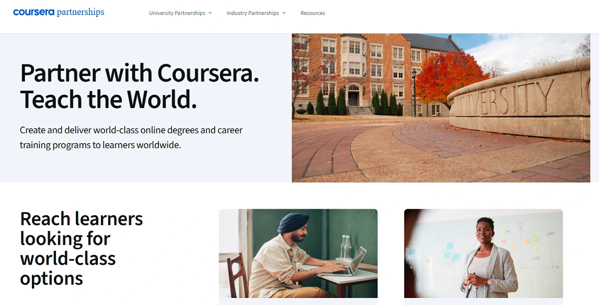 Coursera’s core strengths are its university partnerships and scale. It offers “world-class learning for anyone, anywhere”. Key selling points include: