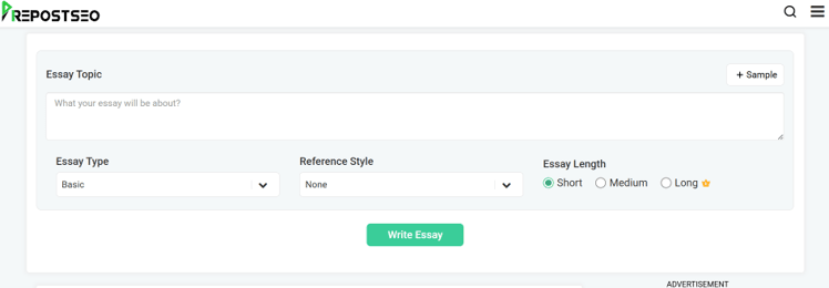 • Features: Prepostseo’s AI Essay Writer is an online tool that generates essays around any topic by user input. You can pick the essay type (narrative, descriptive, comparative, etc.), set an essay length (short, medium, long), and choose reference/citation styles like APA, MLA, Harvard, IEEE.