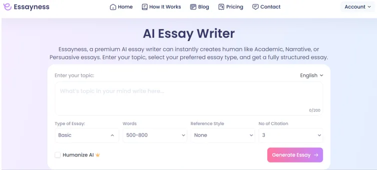 • Features: Essayness uses AI to generate essays instantly from a topic or prompt. It supports multiple essay types, citation styles, and word-count options.