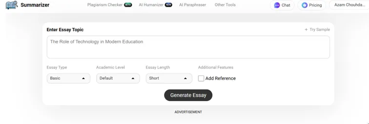 • Features: Summarizer.org offers an AI essay generator where you input the essay topic, choose the essay type (basic, descriptive, narrative, persuasive, comparative, academic), adjust length (short, medium, long, extensive), and optionally add references.