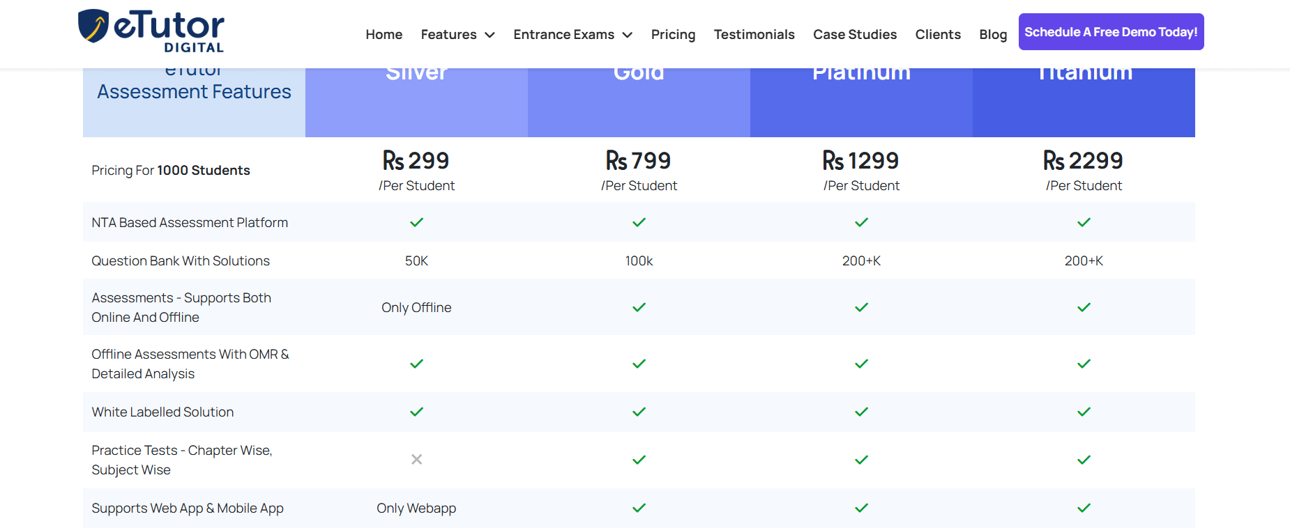 eTutorDigital does not list standard tutoring rates by the hour. Its pricing is aimed at institutions. On the site, fees are shown per student for large plans (for example, tiered values like 299, 799, 1299, 2299 per student for 1000-student packages). These figures seem designed for school-wide subscriptions. In other words, a school pays a fixed fee per student for a package of services. There are no public rates for individual tutoring sessions. By comparison, many tutoring platforms charge students by the hour or via subscription. For instance, MEB’s rates start at around $20 per hour.