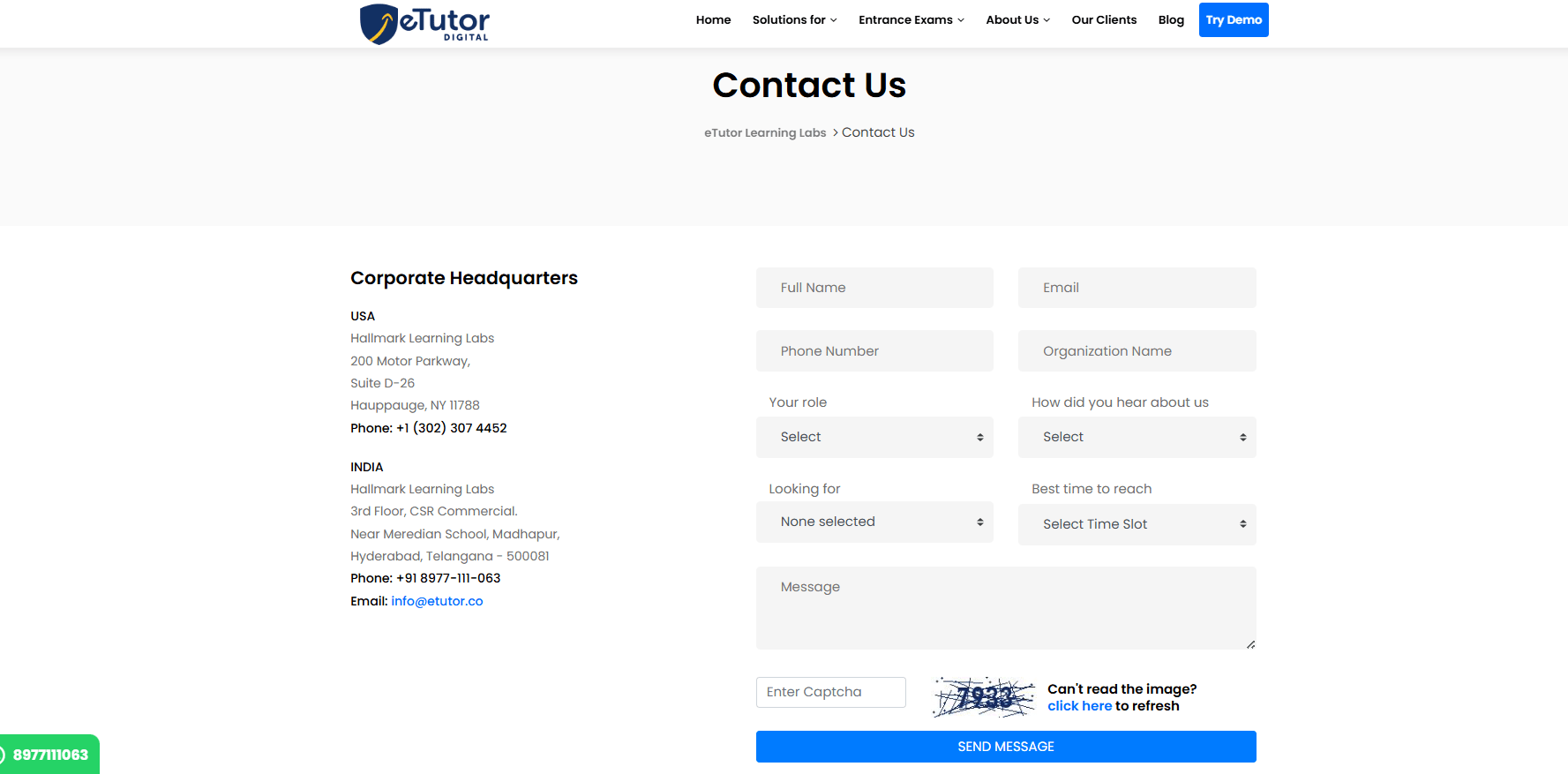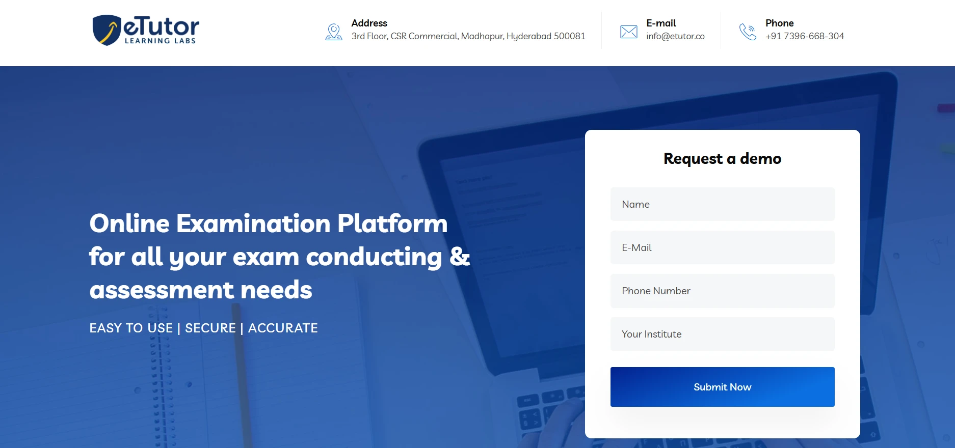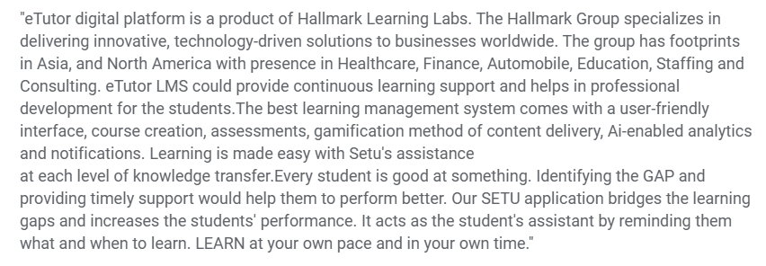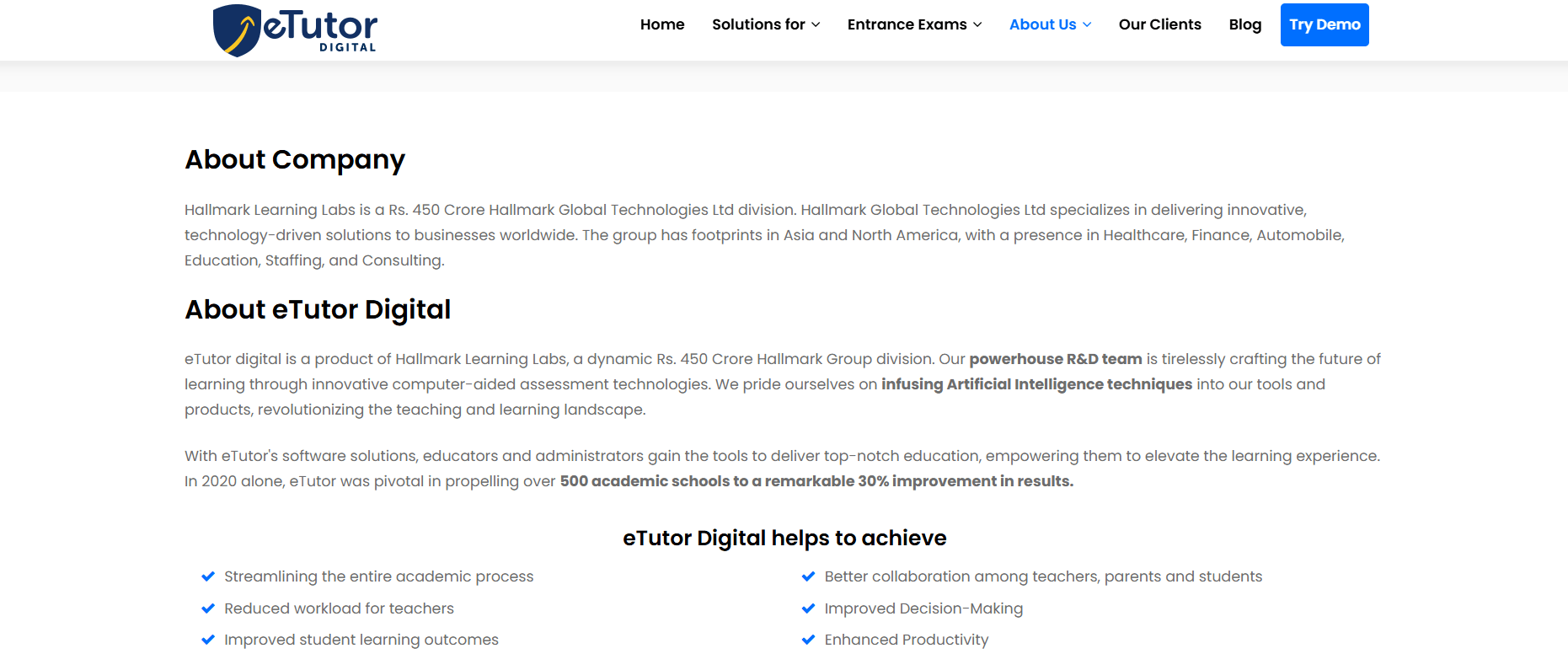 eTutorDigital (by Hallmark Learning Labs) was founded in 2004. Its unique selling points are integration and technology. It bundles multiple educational tools – school management (ERP), learning management, and online exams – into one system. It uses AI to auto-generate tests and quizzes from question banks, automatically grade them, and give teachers instant analytics. It supports both web and mobile apps and multiple languages, so students can learn anywhere, even in their native language.