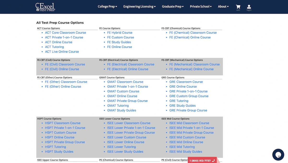 Excel Test Prep covers three main categories: College Prep, Grad School, and Engineering Licensure.
