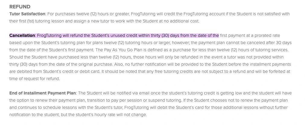 Frog Tutoring has a clear refund/cancellation policy. If you cancel unused hours, Frog will refund them on a prorated basis (for both one-time and installment plans) as long as it’s within 30 days of payment. They also promise a satisfaction guarantee: if you’re not happy after the first tutoring session, Frog will credit your account and find you a new tutor at no extra cost. So you do get recourse if the tutor isn’t a good fit. Make sure to cancel packages quickly if needed – after 30 days you lose the cancellation right on installment plans.