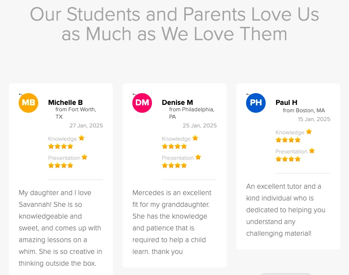 Frog Tutoring’s own website shows many positive testimonials. Customers praise its knowledgeable, engaging tutors and flexible scheduling. For example, one parent said a tutor was “very knowledgeable and appreciated his calm way of teaching”. Another student reported grade improvements and confidence boosting. Frog highlights a 100% satisfaction guarantee (if the first lesson isn’t satisfactory, they assign a new tutor or credit your account).
