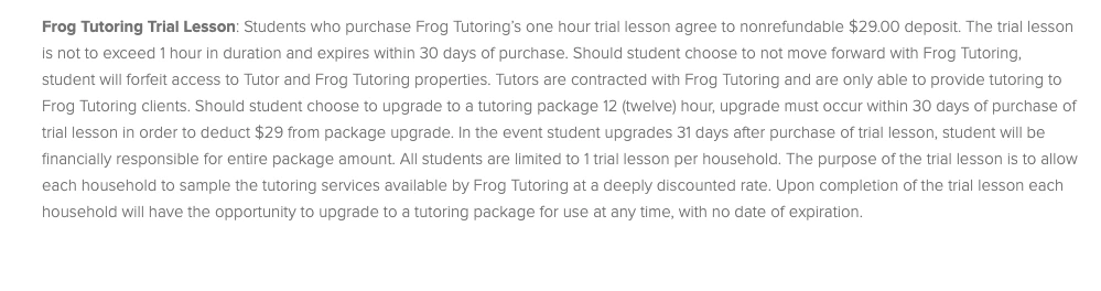 • How much does Frog Tutoring cost? Rates vary by subject and location, but Frog’s listed pricing is typically about $37–$65 per hour. They charge by package; for example, they offer hourly packages that don’t expire. A trial lesson costs $29 (nonrefundable deposit). Travel fees or late fees can add to the cost. For an exact quote, you must contact Frog directly – the company will give a personalized rate based on your needs.