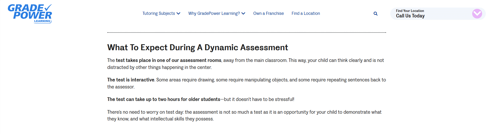 Students start by contacting GradePower Learning (online or by phone) to arrange an assessment. Every new student takes a “Dynamic Assessment” – a two-hour diagnostic test that identifies the student’s strengths and weaknesses. Based on this, GradePower creates a custom learning plan. Then the student is matched with a qualified tutor who uses the GradePower curriculum.