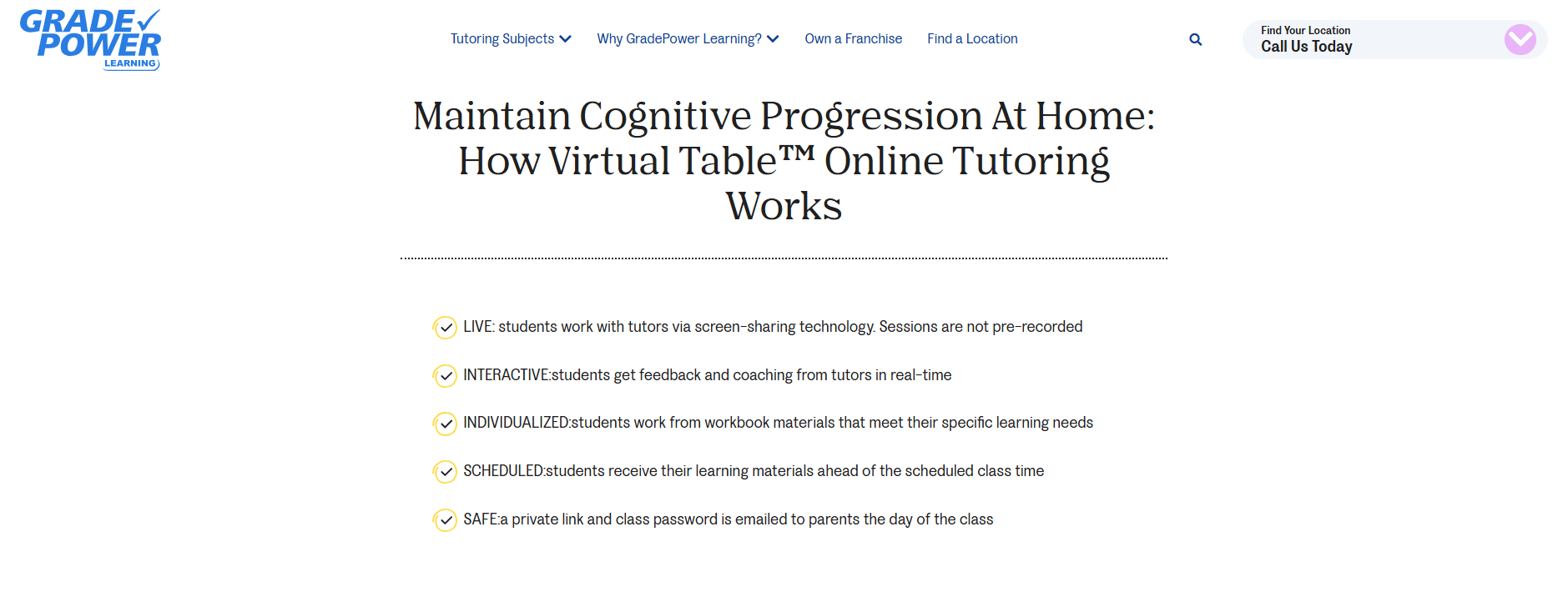 A: Yes. In addition to in-center lessons, GradePower has an online platform called Virtual Table™ where students can meet tutors via video and digital whiteboard. This allows students to receive the same one-on-one tutoring from home with qualified GradePower tutors.
