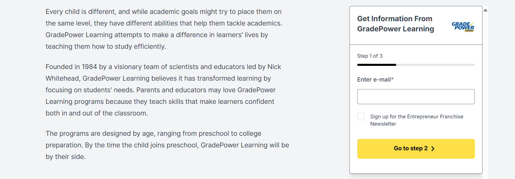 A: Yes. GradePower Learning is a franchise system. It started franchising in the early 1990s. Today there are roughly 150 GradePower centers in the U.S. and Canada. Each center is independently owned but follows the corporate curriculum and methods.
