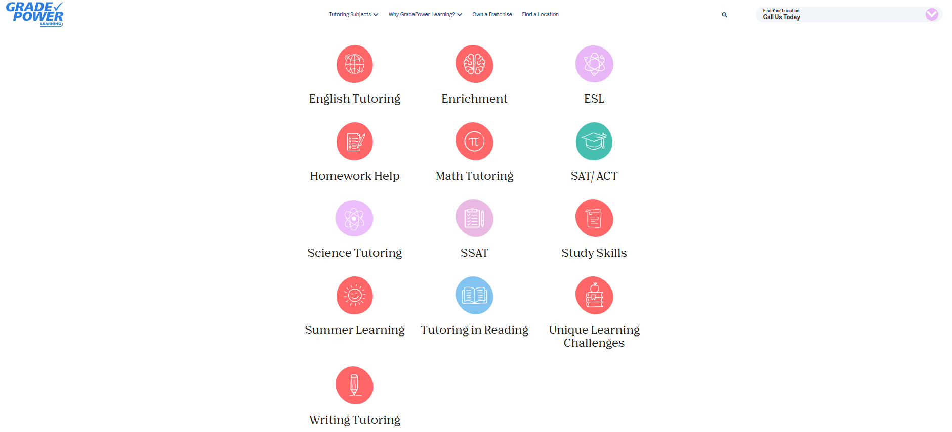 GradePower offers primarily one-on-one tutoring (in-center and online). Other services include cognitive learning assessments, test prep (SAT/ACT, SSAT), homework help, and group workshops. They call their teaching method “cognitive learning,” focusing on critical thinking, executive function, and learning strategies. All GradePower tutors are specially trained in this method.