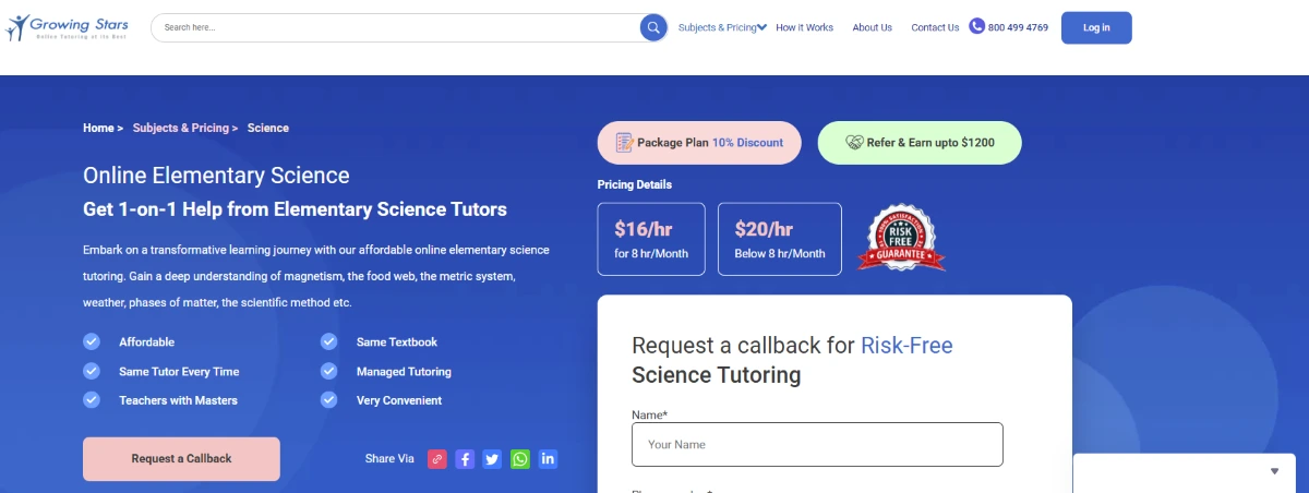 Growing Stars offers monthly tutoring packages. For example, a package of 8 hours per month costs about $120 ($15/hour), and 4 hours costs $80 ($20/hour). These rates are quite low for online tutoring. In general, math and science tutors can charge anywhere from $15 to $80 per hour in the US. Growing Stars tutors all have master’s degrees, so more advanced subjects may cost more. Exact pricing can vary by grade and course. You can view up-to-date rates on the Growing Stars Pricing page.