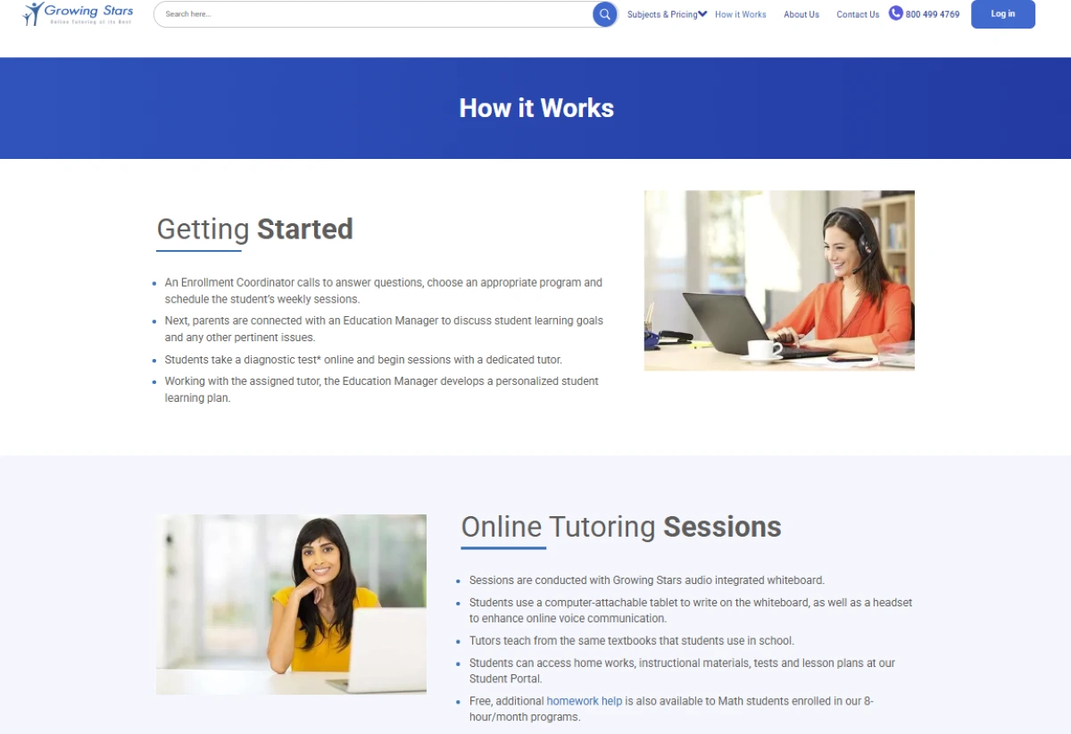 First, sign up online and describe your tutoring needs (subject, grade, goals). An education manager reviews your profile and matches you with a tutor. You schedule regular sessions (usually once or twice per week) using their online portal or phone. Before each lesson, your tutor is given your textbook and study materials to prepare. During the lesson, you work one-on-one via video chat and an online whiteboard. After each session, the manager tracks progress and sends reports to parents. Growing Stars handles all scheduling and billing automatically. It is very easy for students: just log in, click to schedule, and join the video lesson at the appointment time.