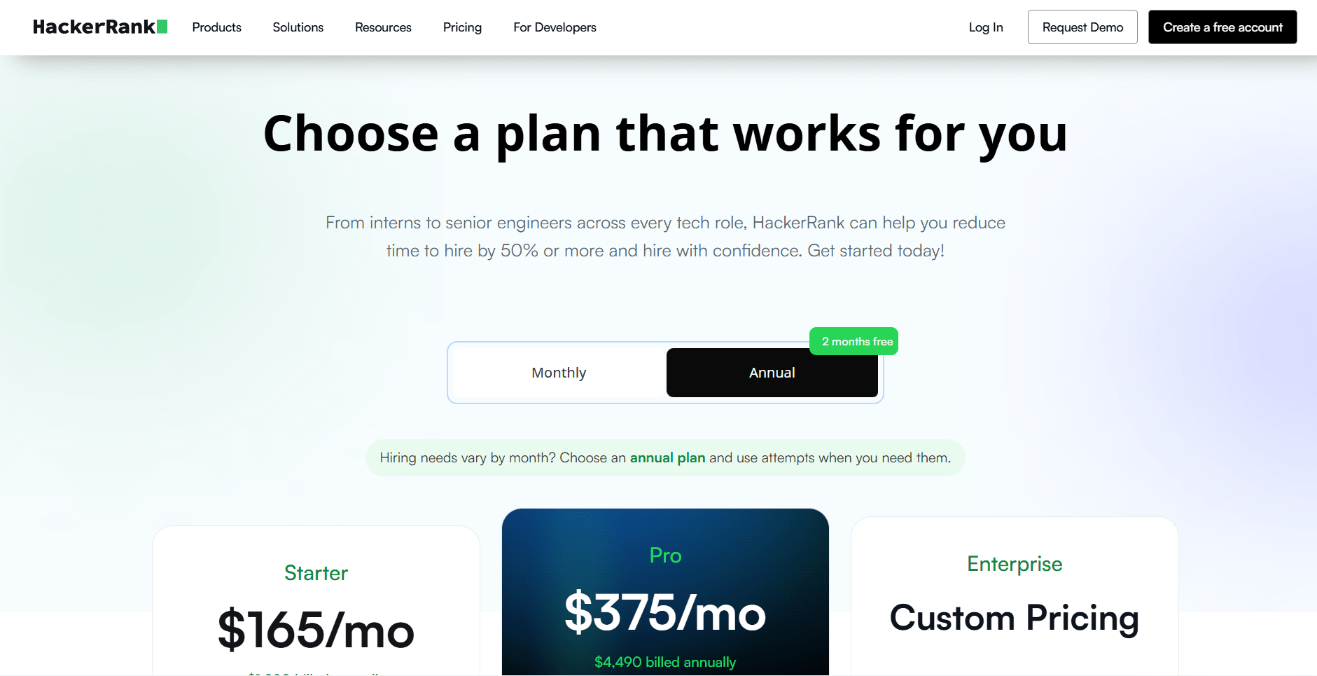 HackerRank offers monthly or annual billing: you can pay month-to-month or get 2 months free with annual payment. Payments are usually by credit card or invoice, and plans auto-renew until canceled. There are no student or income-based discounts listed. The plans cover unlimited users on top tiers. Coupons or special rates are not a common feature, and subscriptions are straightforward.
