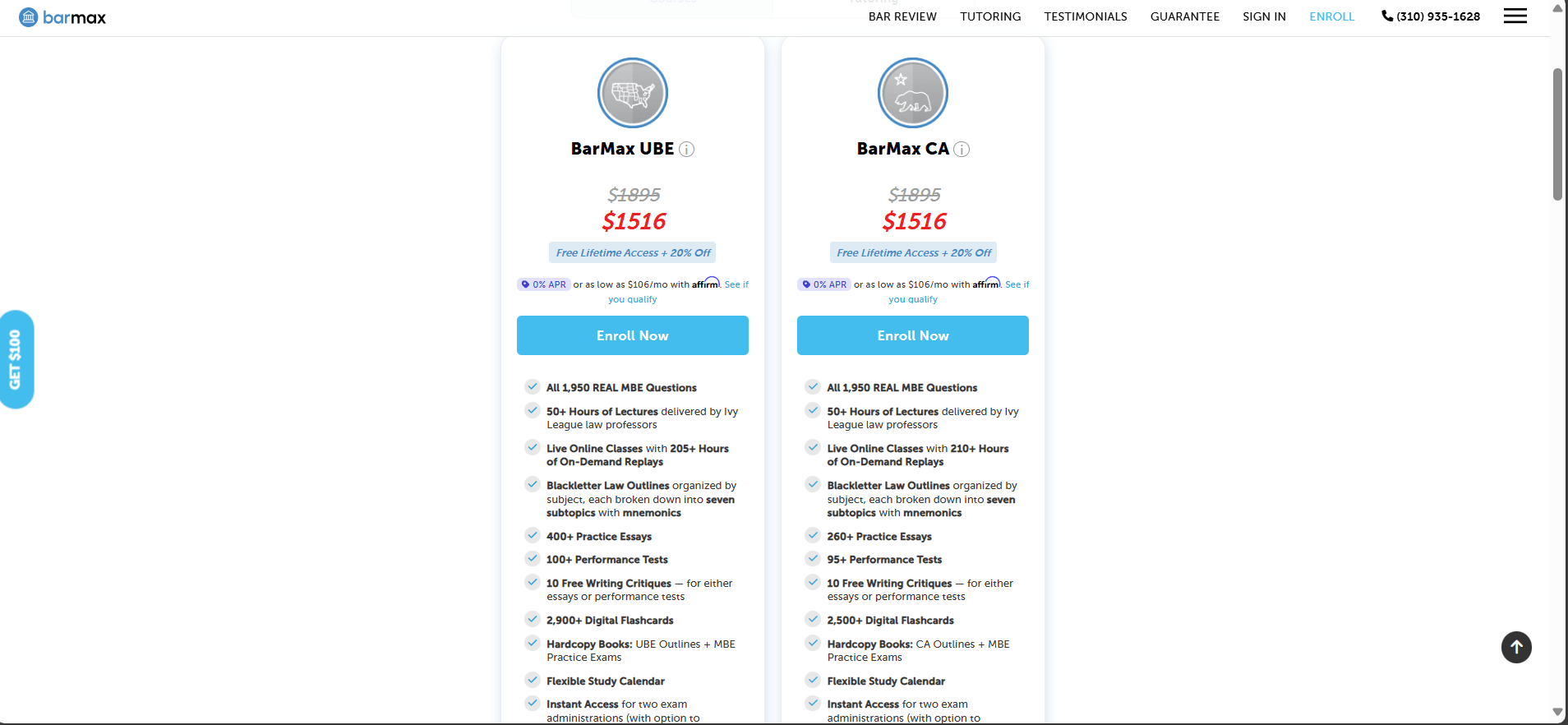 Both companies accept standard payment (credit card) and also 0% financing through Affirm. With Affirm, LSATMax payments can be as low as ~$42/month, and BarMax payments as low as ~$75-$106/month depending on course. LSATMax honors LSAC fee waivers: qualifying students get the course free (via a Fee Waiver Scholarship). BarMax has a public-interest/military scholarship reducing the price to ~$1,248. Both sites run occasional promos (for example, referral codes give $100 off) and students watch for sales around LSAT/bar schedules.
