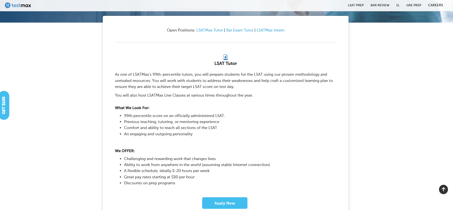 To become a tutor on LSATMax or BarMax, candidates apply through the TestMax careers site. Tutors must meet strict criteria: for LSATMax, only those who scored in the 99th percentile on the LSAT are considered; for BarMax, tutors must have passed the bar exam in their subject area. Prospective tutors submit resumes and recommendations online. Selected tutors are paid employees, not freelancers – they start at around $50 per hour. The schedule is flexible (typically 5–20 hours/week) and tutors can work from anywhere with internet. If you qualify, you can apply via TestMax’s site (see the “Tutors” or “Careers” page on testmaxprep.com).