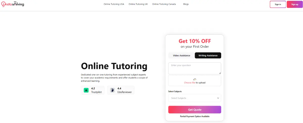 After requesting help, you choose payment. Instasolving accepts credit/debit cards via Stripe. There are no set packages to buy – you pay per assignment or session. The platform runs promotions instead of subscriptions. For instance, new customers get a coupon (10% off). No membership is needed; you simply pay online each time. Overall, pricing is on-demand: pay only for the help you use.