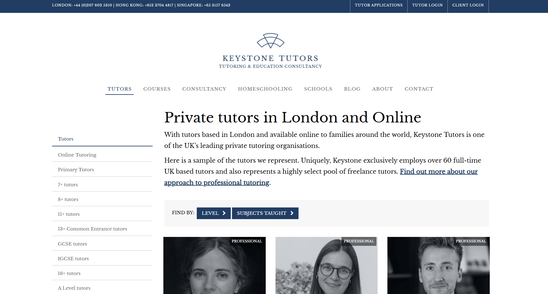 Where is Keystone Tutors based? The company is headquartered in London, UK, with additional offices in Hong Kong and Singapore. It primarily serves English-speaking students in the UK, Hong Kong, Singapore and other international schools, although all sessions can be done online anywhere.