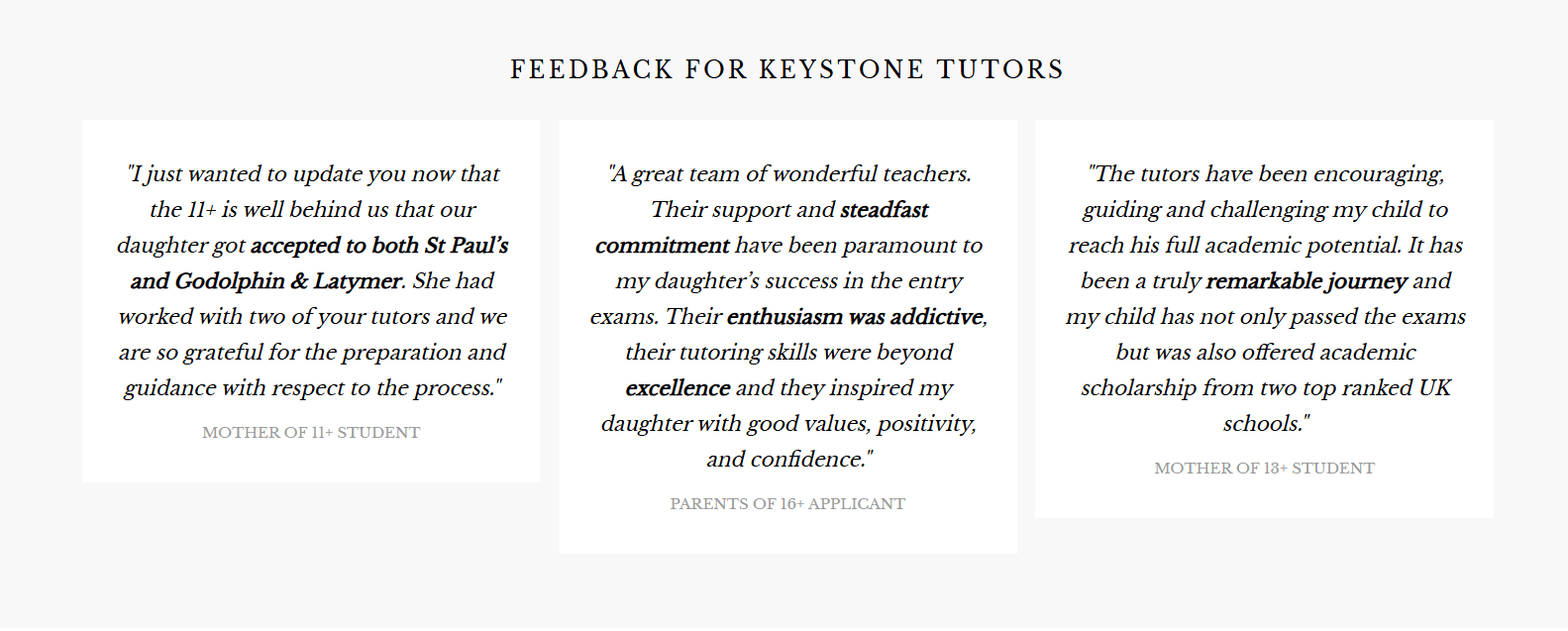 Keystone’s official site publishes many glowing testimonials. Parents and students consistently praise the quality of tutors and the improvements they see. For example, one parent said Keystone’s tutor was “an excellent teacher” who made lessons enjoyable and helped their child gain confidence. Another review thanked a tutor for giving their son “incredible support” in maths, making him feel “calm, prepared and confident” for exams. Overall, on-site reviews emphasize professional, engaging tutors who deliver better grades and confidence.