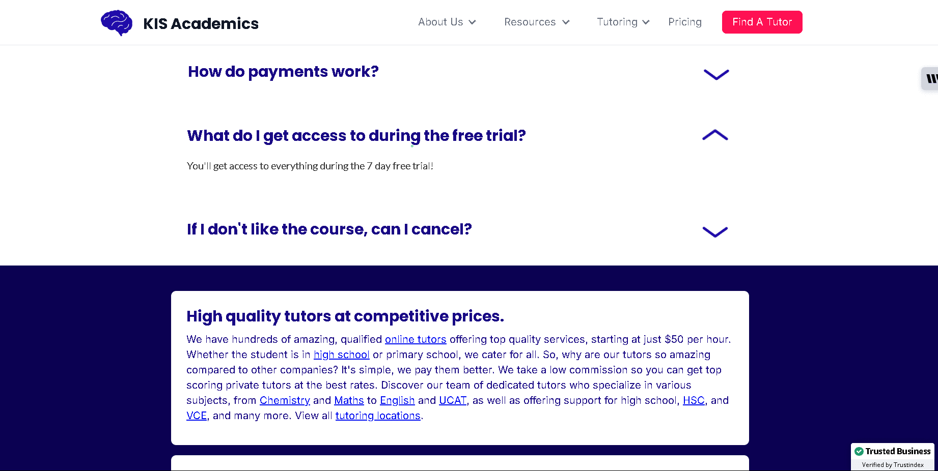 A: Yes – new tutoring students get a free 30-minute “study skills” session with their tutor. Online courses often offer a 7-day trial, after which subscription charges begin.