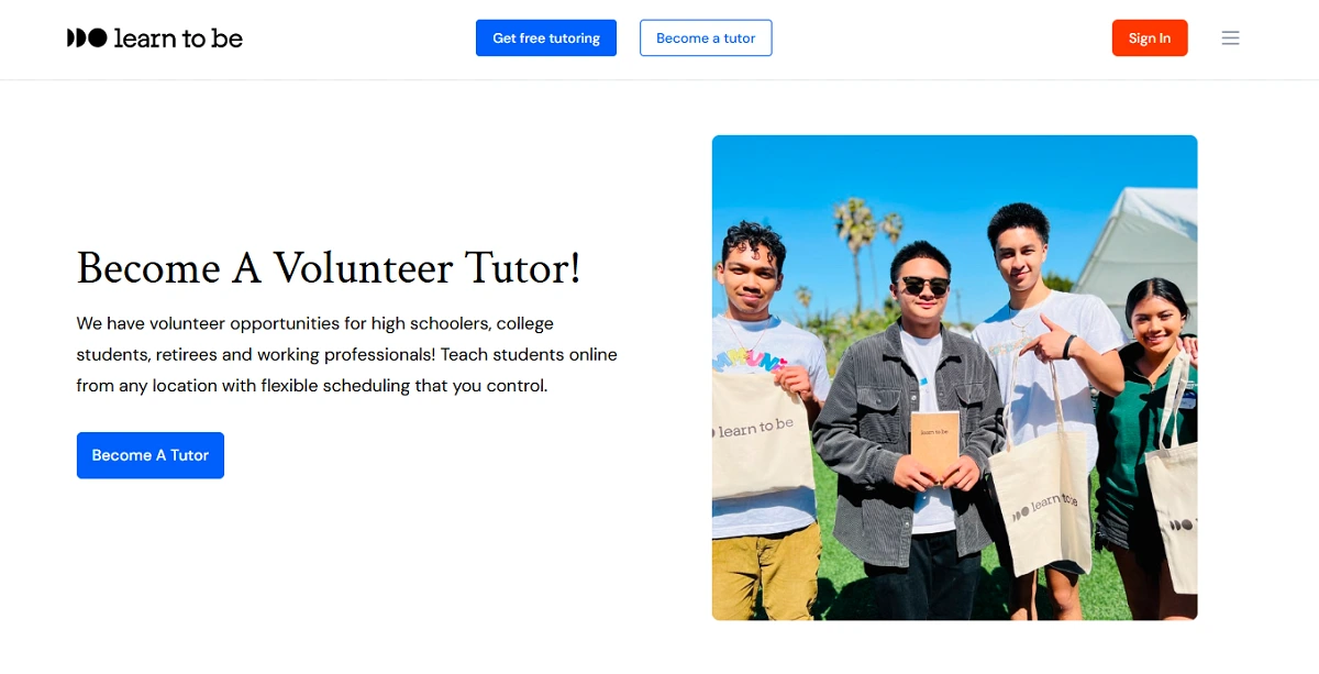 Founded in 2008, Learn To Be is a nonprofit tutoring charity (501(c)(3)) based in California. The founders are Stephen Chen and Neeraj Kapoor. Its mission is to eliminate educational inequity by providing free tutoring to underserved communities. Learn To Be primarily serves students in the United States, especially those in low-income or foster-care situations. By 2025 it reports over 200,000 hours of free tutoring delivered to about 11,000 students. The organization is very small (estimated fewer than 10 staff), relying on a network of volunteer tutors nationwide.Learn To Be offers 1-on-1 online tutoring for K–12 students. The core services are focused on academic tutoring: math, reading/language arts, science, and social studies. Essentially, any standard school subject is covered through the volunteer tutors. (In practice, tutors commonly help with math and reading skills.) The platform also has summer and writing help, and is set up to let students ask questions on other topics as needed. All tutoring is done remotely through their digital classroom.