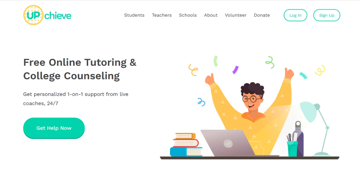 Pros: UPchieve is another nonprofit offering free online tutoring for low-income high school students. It provides on-demand help (24/7) in math, science, and writing, plus college counseling. Like Learn To Be, UPchieve targets underserved youth. Its tutors can be certified teachers or college volunteers, and sessions can happen immediately when students request help. Cons: UPchieve is mainly for middle and high school students, not elementary age, and it focuses on quick question answering (often text or instant messaging) rather than scheduled weekly sessions. It may not offer the long-term tutor-student relationship that Learn To Be does. Also, as a free service, session availability can sometimes be limited during peak demand.