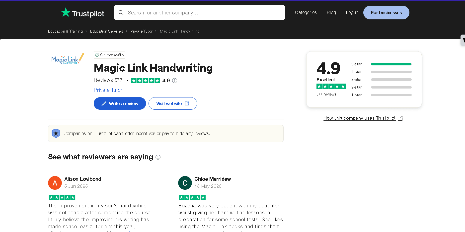 Trustpilot: Magic Link Handwriting boasts over 500 reviews on Trustpilot. The company reports a 5‑star average rating, with parents praising the program’s effectiveness. For example, one testimonial calls it “transformational” for a 9-year-old’s writing. Common positive themes: clear, step-by-step instruction; rapid improvement in legibility; and motivated students. Negative feedback is rare.