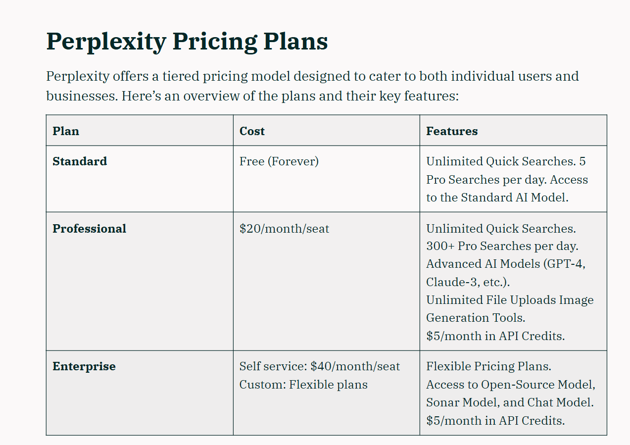 This pricing ladder summarizes Perplexity plan costs so students can compare tiers before subscribing.