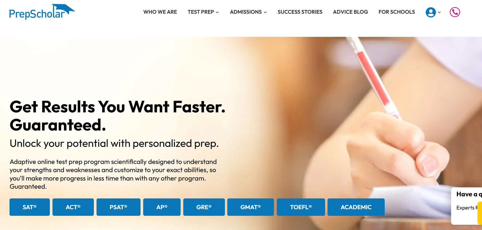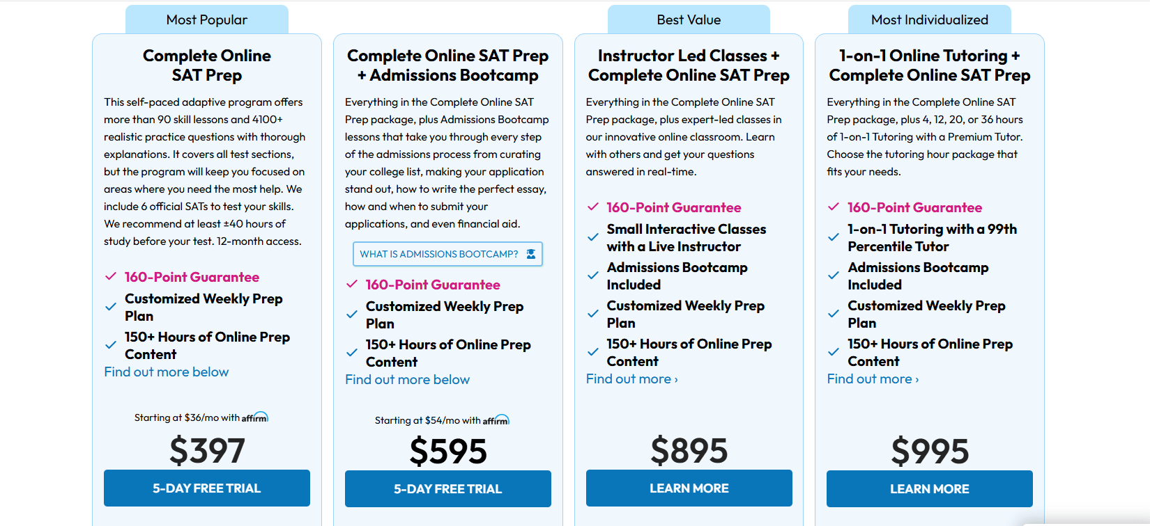 Services: Online SAT/ACT/PSAT prep, plus prep for college entrance tests (GRE, GMAT, TOEFL, etc.). It also offers AP course review and a full college admissions bootcamp (essays, applications, financial aid). Students can choose self-study courses, live online classes, or private tutoring. All courses come with progress tracking and official practice test integration.