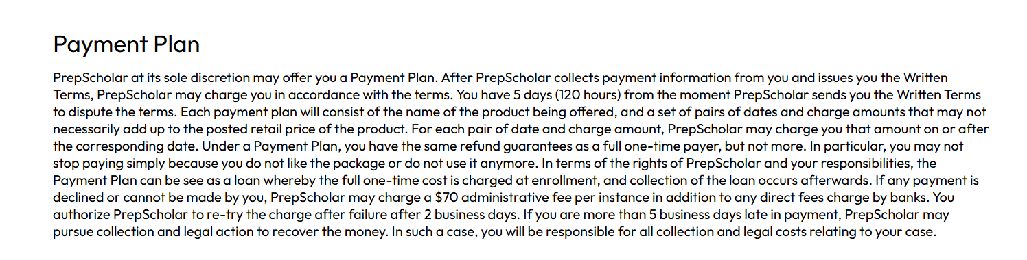 - Payment Plans: Treated like a loan. You must keep paying off your course even if you stop using it. PrepScholar may charge up to $70 if a payment fails.