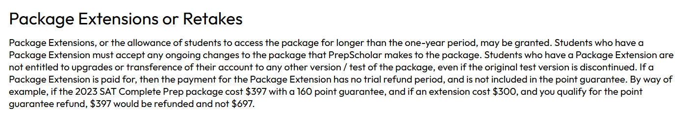 - Extension costs: A one-year course can be extended by another year for about $180, but this extension fee is not covered by the score guarantee. In a refund, only the original price is returned (e.g. $397, not including extension fees).