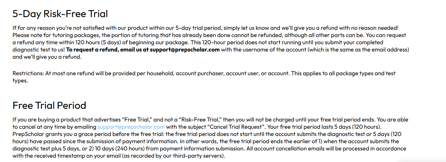 - Tutoring refunds: If you seek a refund after using tutoring, PrepScholar requires you to forfeit any unused tutoring hours to get back the course cost.