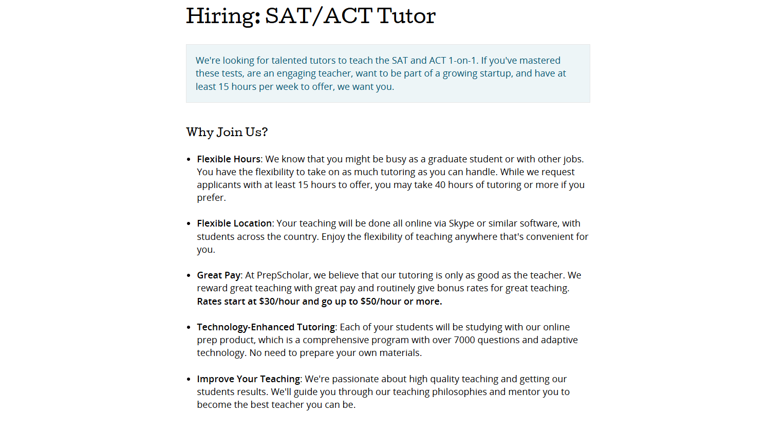 Tutors are paid well for the test-prep market. Pay rates start around $30–$50 per hour, and actual earnings average about $60,000 per year for full-time equivalent work. Preparatory materials are provided; tutors don’t have to create content. They also get training in PrepScholar’s teaching methods.